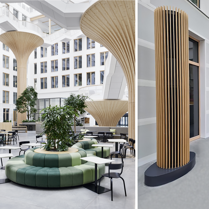 The customer had special requests for the lobby, atrium hall. It was asked to represent a forest to emphasise the sustainability focus of the entire building. The lobby was also supposed to be open and airy, and the architect therefore designed it in different levels, just like a real forest.