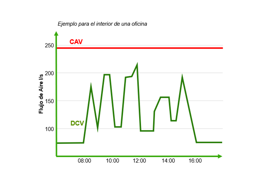 Un sistema de ventilación controlado en función de la demanda es la solución al método de ventilación "estática" anterior. Ambos se muestran en el gráfico de la derecha.
